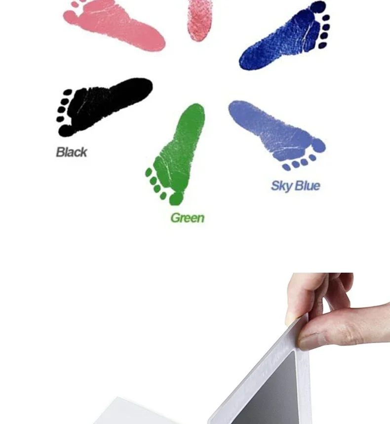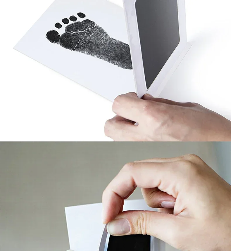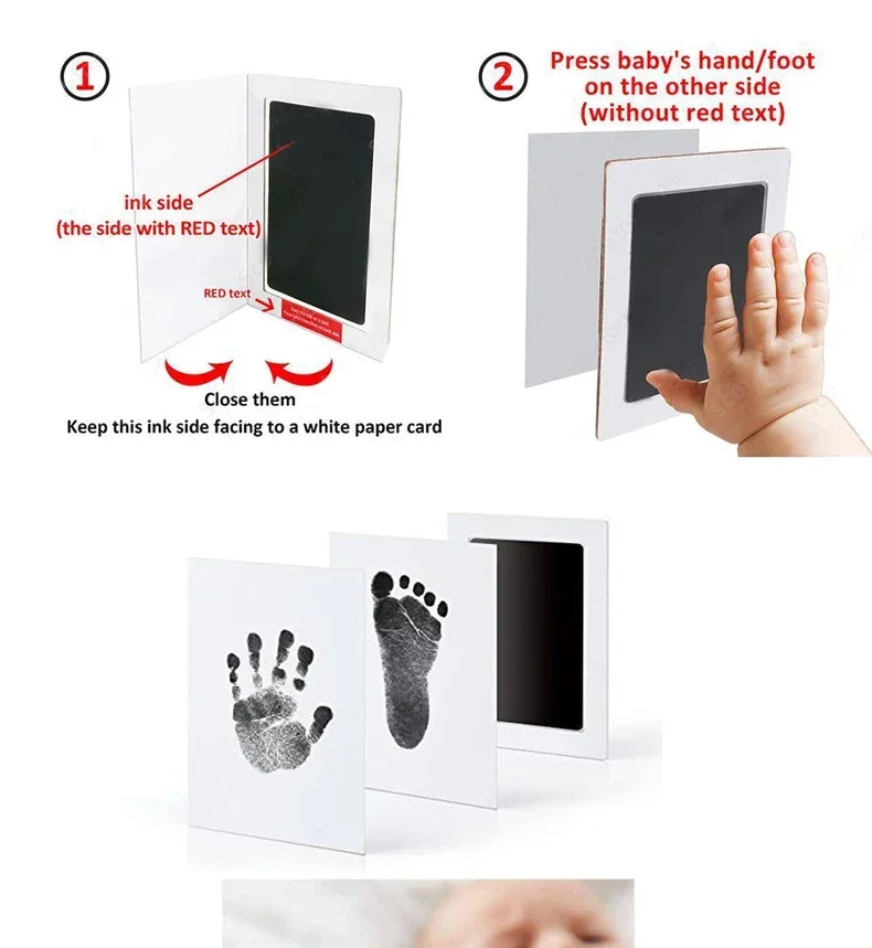 Simple using process: first you should place the handprint ink pad face down on the paper or card, gently press your baby’s hand or foot or your pet’s paw on the print pad, after a few seconds, the print will be done, quick to dry and no additional stains included